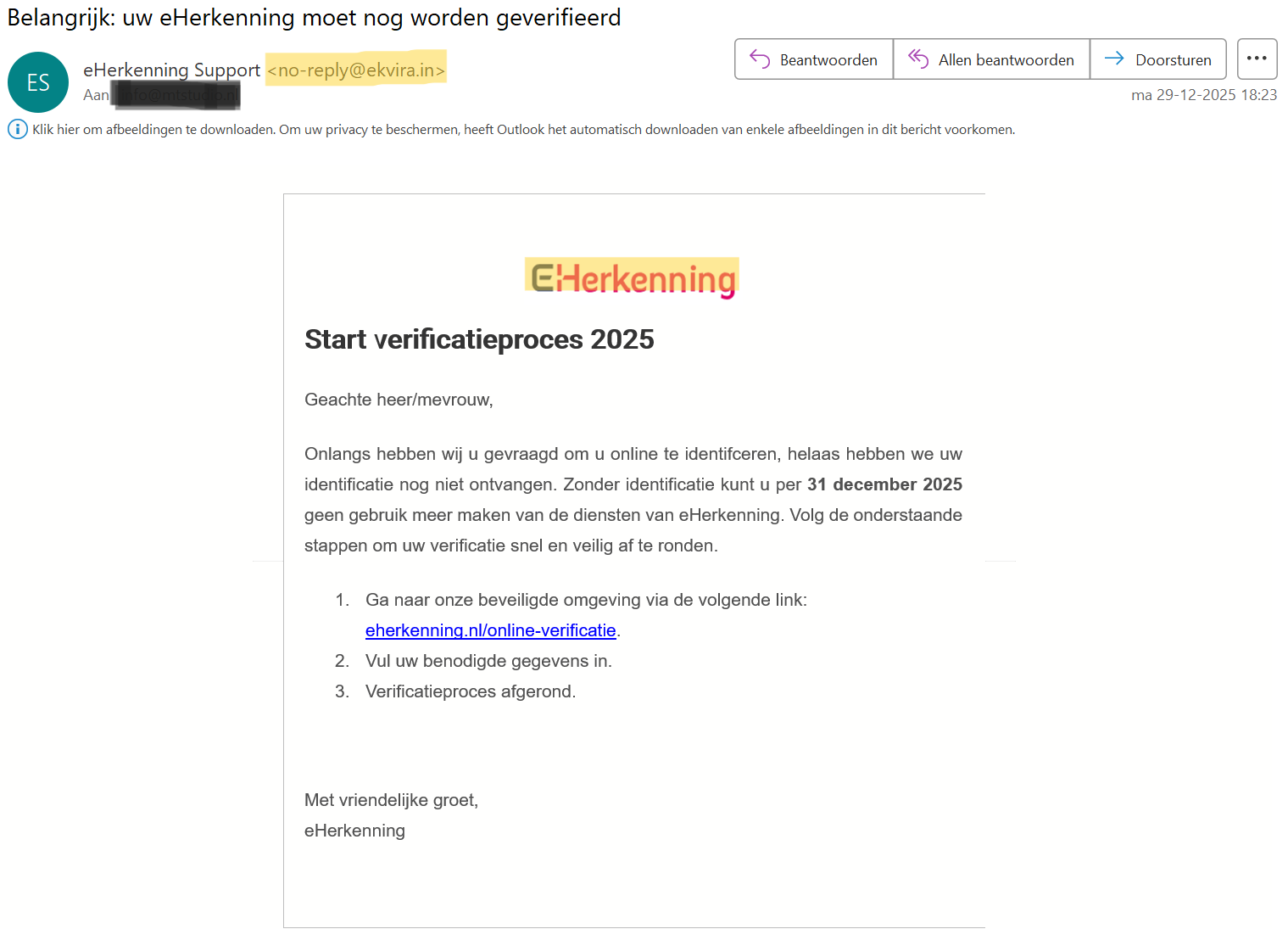Links in nepmails kunnen ervoor zorgen dat er schadelijke software op uw computer wordt geïnstalleerd of leiden u naar valse websites. Klik dus nooit zomaar op de links en een e-mail die u niet vertrouwt. - Wij communiceren NIET uit naam van eHerkenning